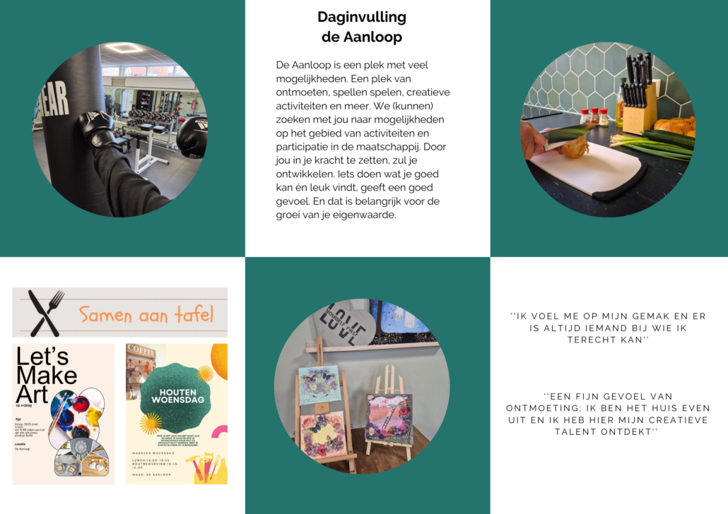 Aan de Frisialaan in Harderwijk hebben we zinvolle tijdsbesteding De Aanloop. Hier kan je van alles doen, van ontmoeting tot het spelen van spellen, schoonmaken wagenpark, doen van creatieve activiteiten, koken, en onderhoud van het kantoorterrein. We horen graag wat jij leuk vindt om te doen, waardoor je aan de hand van deze activiteiten in een eerste aanzet komt tot activering en ontmoeting buiten je eigen woonplek om. Dit kan soms nodig zijn om jezelf klaar te stomen voor een stap verder naar werk activerende zinvolle tijdsbesteding of re-integratie.